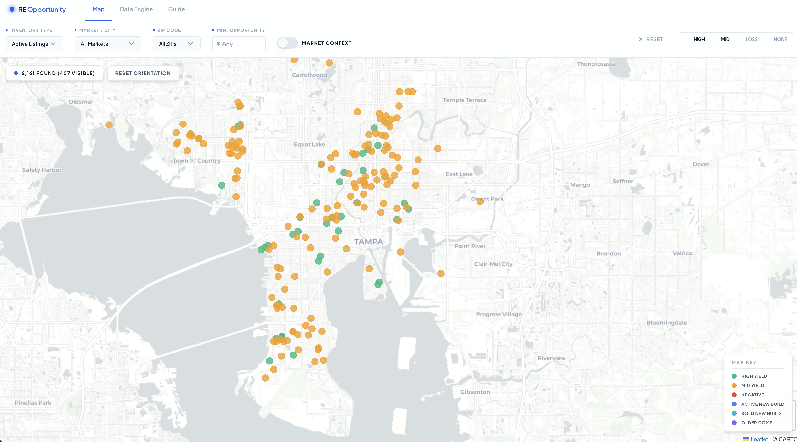 The dashboard is a React app with a Leaflet map. Green dots are the best opportunities, yellow are marginal, red are negative. Click any property and you see the full valuation breakdown plus comparable sales within 0.5 miles, prioritizing new construction. There is a market context toggle that layers active new build listings so you can see what the competition is actually asking right now.