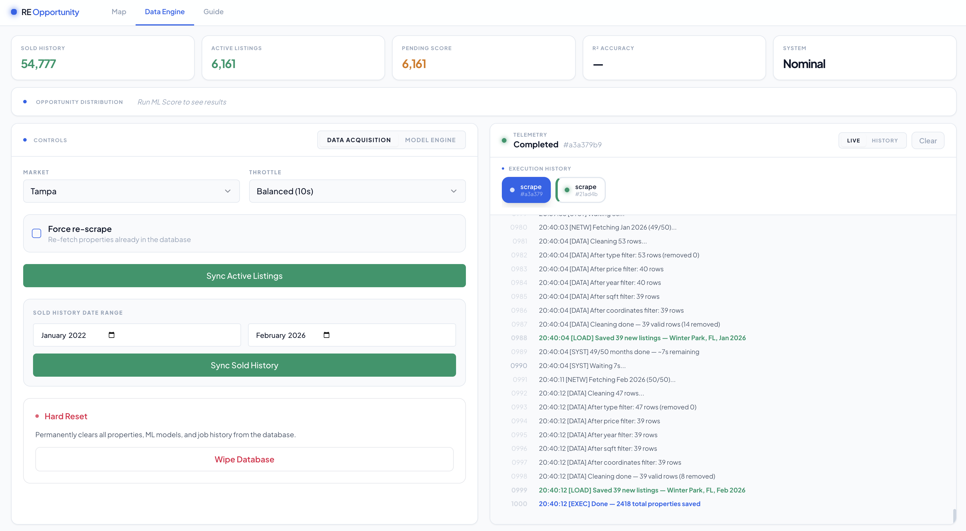 The data engine is a Python service that scrapes MLS listing data from Realtor.com using HomeHarvest. It runs in monthly chunks to avoid hitting result caps, pauses between requests, and cleans everything before it touches the database. Single family homes only, between $100k and $5M, built after 1901, under 5,000 sqft. If it does not have coordinates it gets dropped. The clean records go into Postgres.